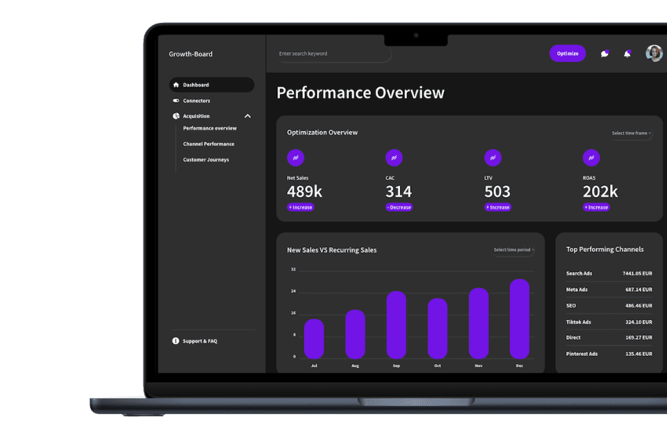 Our platform connects to your website and to your Stripe account. With our proprietary tracking technology and some smart algorithms, we help you measure and optimize all your marketing channels, while delivering insights that will contribute to your growth!